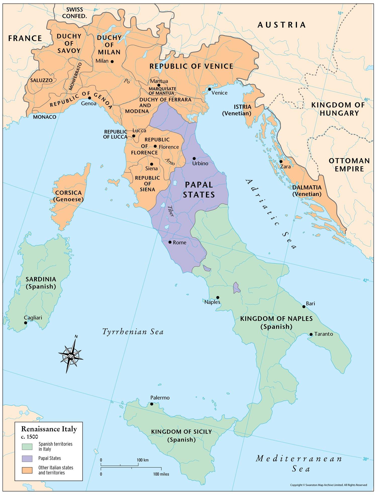Map of Italy renaissance. Renaissance Italy map (Southern Europe - Europe) to print. Renaissance Italy map (Southern Europe - Europe) to download. The term Italian Renaissance has not gone unchallenged; its meaning and boundaries have aroused much controversy. From the 1340s the idea of “rebirth” was a commonplace in critical writing. Authors spoke of how, with Dante and Giotto, both poetry and painting had been “reborn,” and in the following two centuries the same notion was often applied to other areas such as architecture, sculpture, and philosophy as its shown in renaissance Italy map. In this period, “rebirth” was always used in connection with some intellectual or artistic skill; it was not until the 19th century that historians such as the French Jules Michelet and then, above all, the Swiss Jacob Burckhardt (whose The Civilisation of the Renaissance in Italy was first published in German at Basel, Switz., in 1860) began to write of the Renaissance as a period of time.