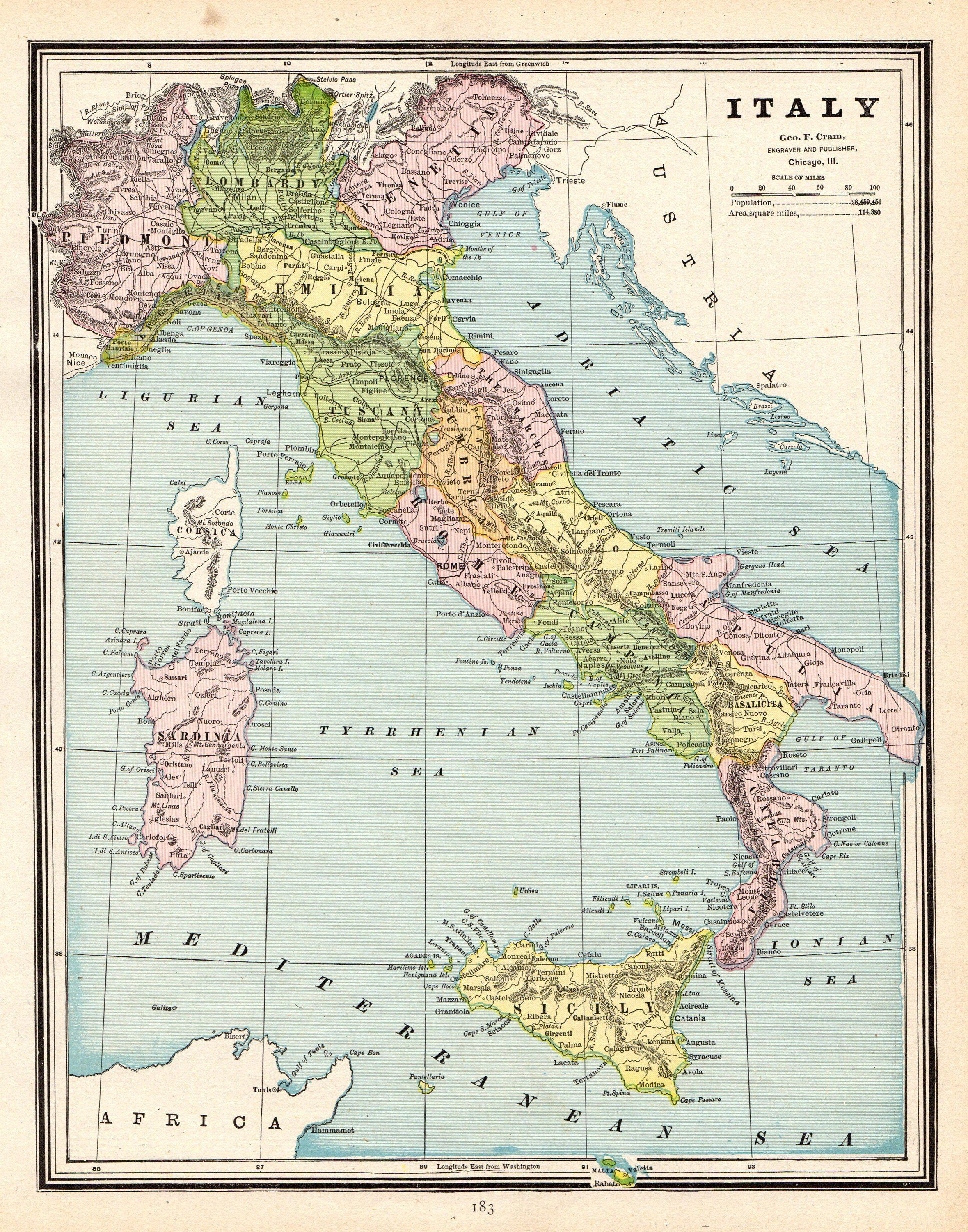 Map of Italy vintage. Vintage map of Italy (Southern Europe - Europe) to print. Vintage map of Italy (Southern Europe - Europe) to download. The Etruscan civilization flourished in central Italy after 800 BC. The origins of the Etruscans are lost in prehistory. The main hypotheses are that they are indigenous, probably stemming from the Villanovan culture, or that they are the result of invasion from the north or the Near East as its shown in the vintage map of Italy. A more recent study has suggested a Near Eastern origin. The researchers conclude that their data, taken from the modern Tuscan population, 'support the scenario of a post-Neolithic genetic input from the Near East to the present-day population of Tuscany’. In the absence of any dating evidence there is however no direct link between this genetic input and the Etruscans.