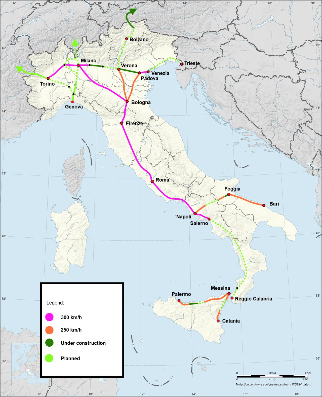 Italy high speed rail map. Italy high speed train map (Southern Europe - Europe) to print. Italy high speed train map (Southern Europe - Europe) to download. Italy opened what is often regarded as Europe's first high-speed rail route, the Direttissima, which from 1978 connected Rome with Florence (254 km/158 mi); however, the major works were only finally completed in the early 1990s, long after France faster TGV network was established as its shown in Italy high speed train map. The maximum speed of the Italian line was 250 km/h (160 mph), giving an end-to-end journey time of just over 90 minutes with an average speed of 200 km/h (120 mph). Since then, Italy high speed network has grown. Services are provided by Trenitalia using both Eurostar Italia (ETR 4xx, better known as Pendolino, which was developed by Fiat Ferroviaria), and more recent ETR 500 series trains (Italian "Eurostars" are unrelated to the Eurostar trains operating between the United Kingdom, France and Belgium).